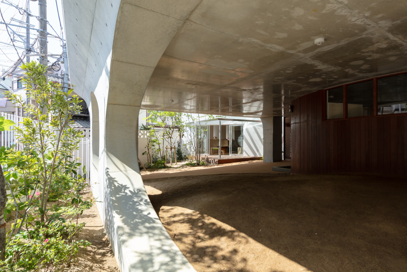 耐震化に伴う建替工事です。 園庭が狭いため、1階をピロティ―とし子ども達の遊び場を造り、2階に室を設けています。 2階の必要面積を確保するためにコンクリートでせり出し、ピロティ―の奥まで光が届くようにしています。 コンクリートに空けた曲面を利用して、子ども達が遊び、建築が遊具となっています。